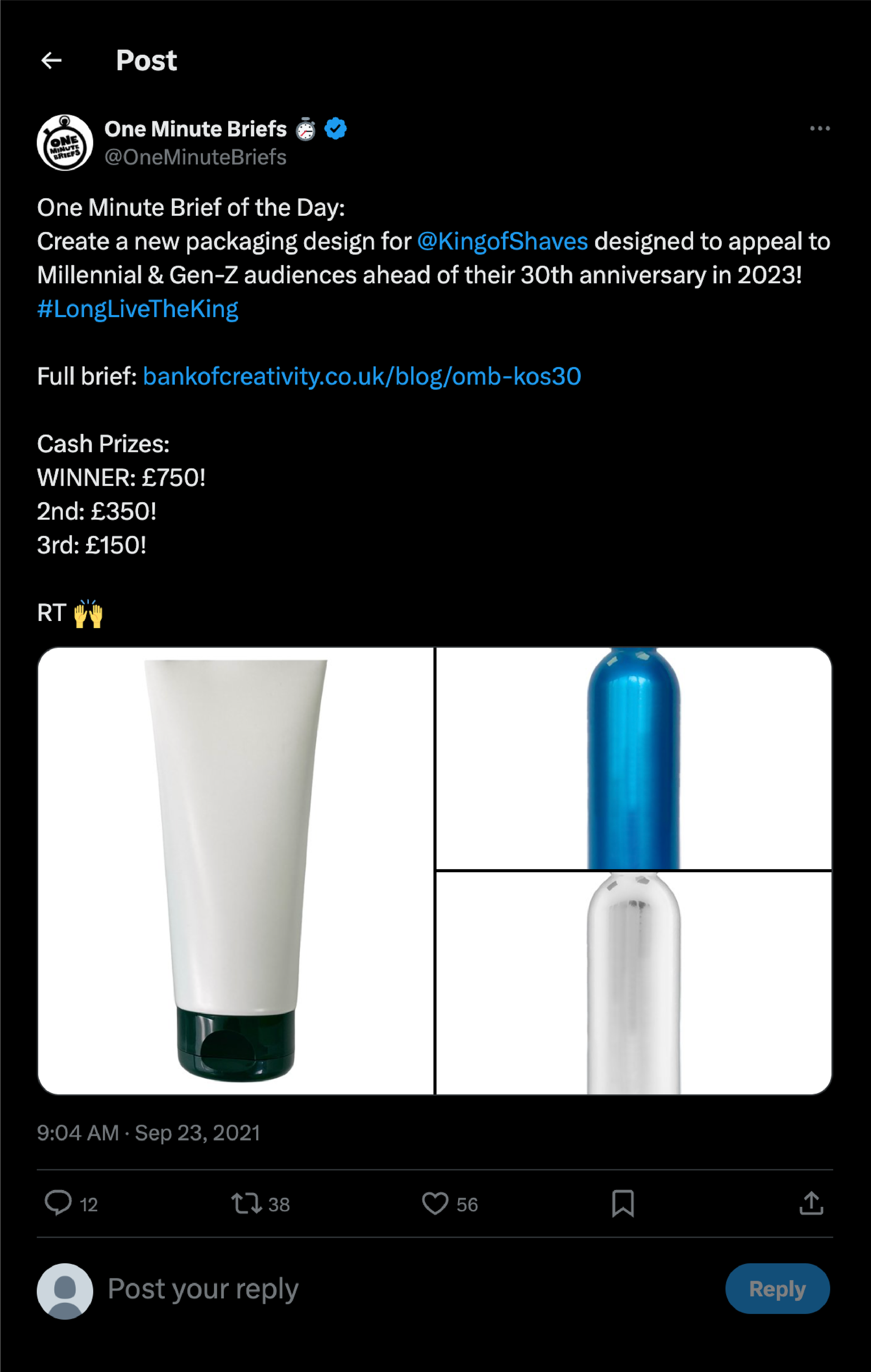 This brief was hosted by One Minute Briefs back in 2021. They had collaborated with King Of Shaves for a one day brief that called for entrants to ‘reimagine’ the current KOS packaging to better appeal to a younger audience. The brief was very open, and it received hundreds of entrants.